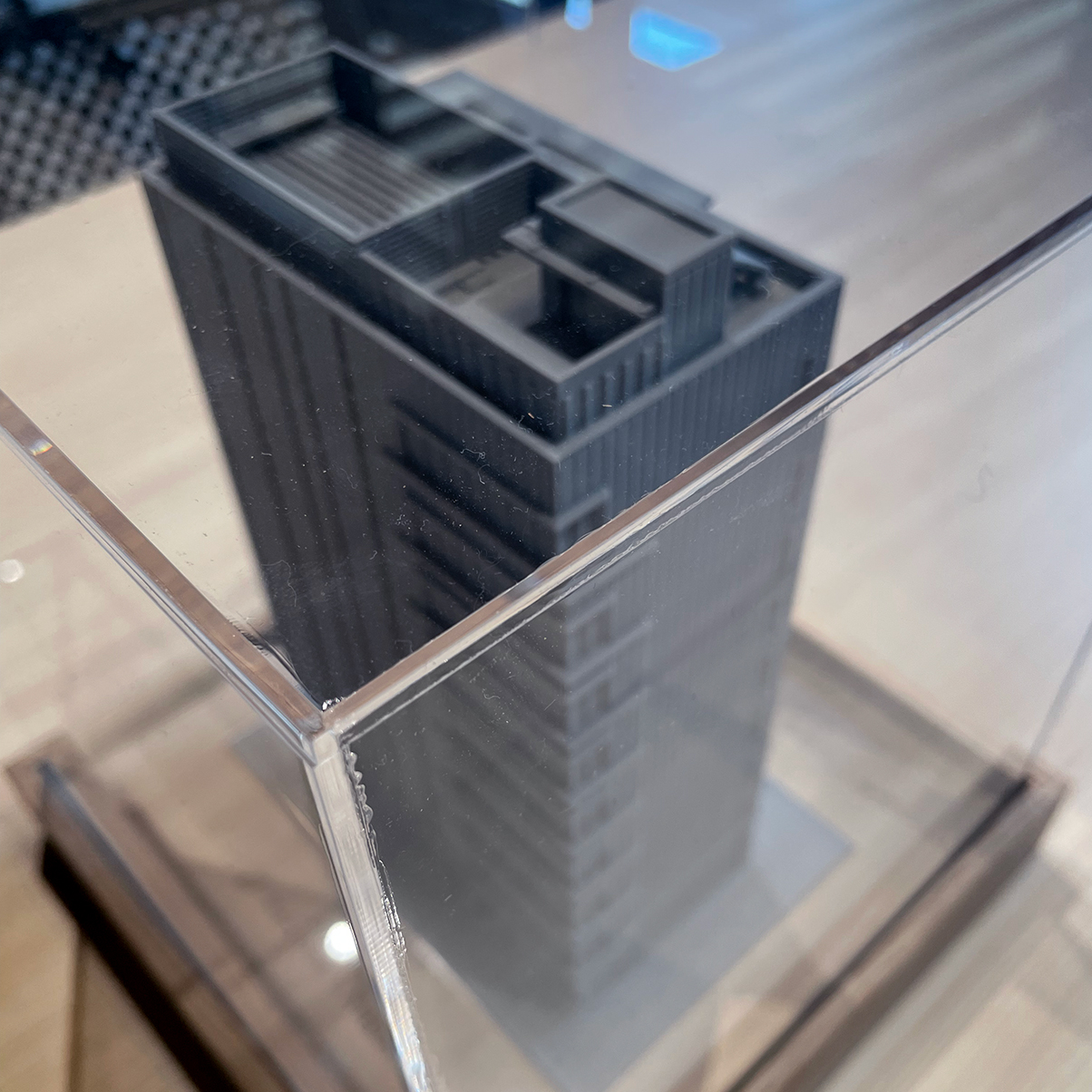 「神田美土代町7丁目」にそびえ立つ新社屋を「北北東」から「南南西」に向かっての視点で描きました。旧社屋のある1丁目と3丁目も構図に組み込み、移りゆく時間の中で生まれ変わるこの瞬間をとらえました。
