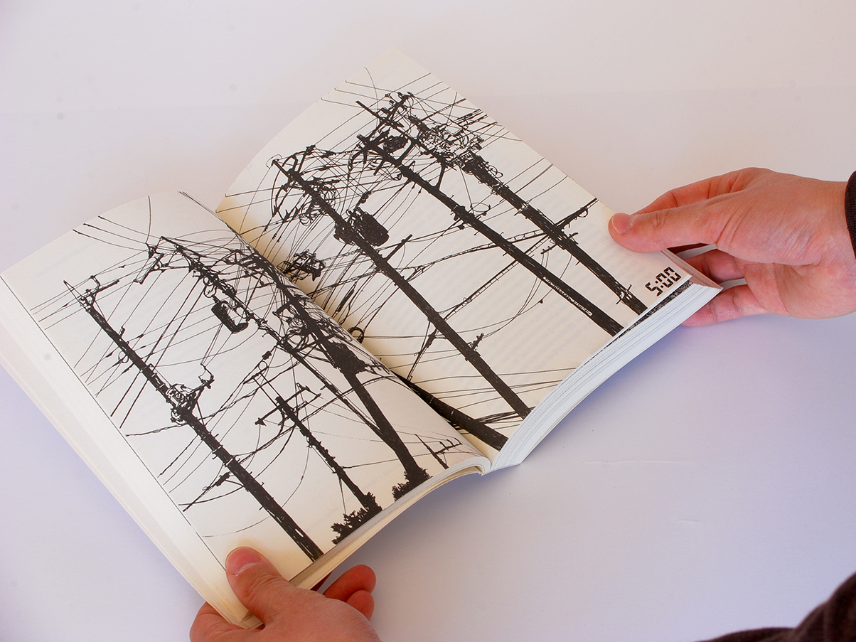 日本の電線を、都心の路線図と見立てて、東京の乱雑さを表現。AM5:00は、誰もいない複雑に絡み合った都心の路線。AM9:00は、活動を始めた東京、朝の電車ラッシュで押し合うサラリーマンを烏と掛けている。よく見るとネクタイをしている烏がいる。