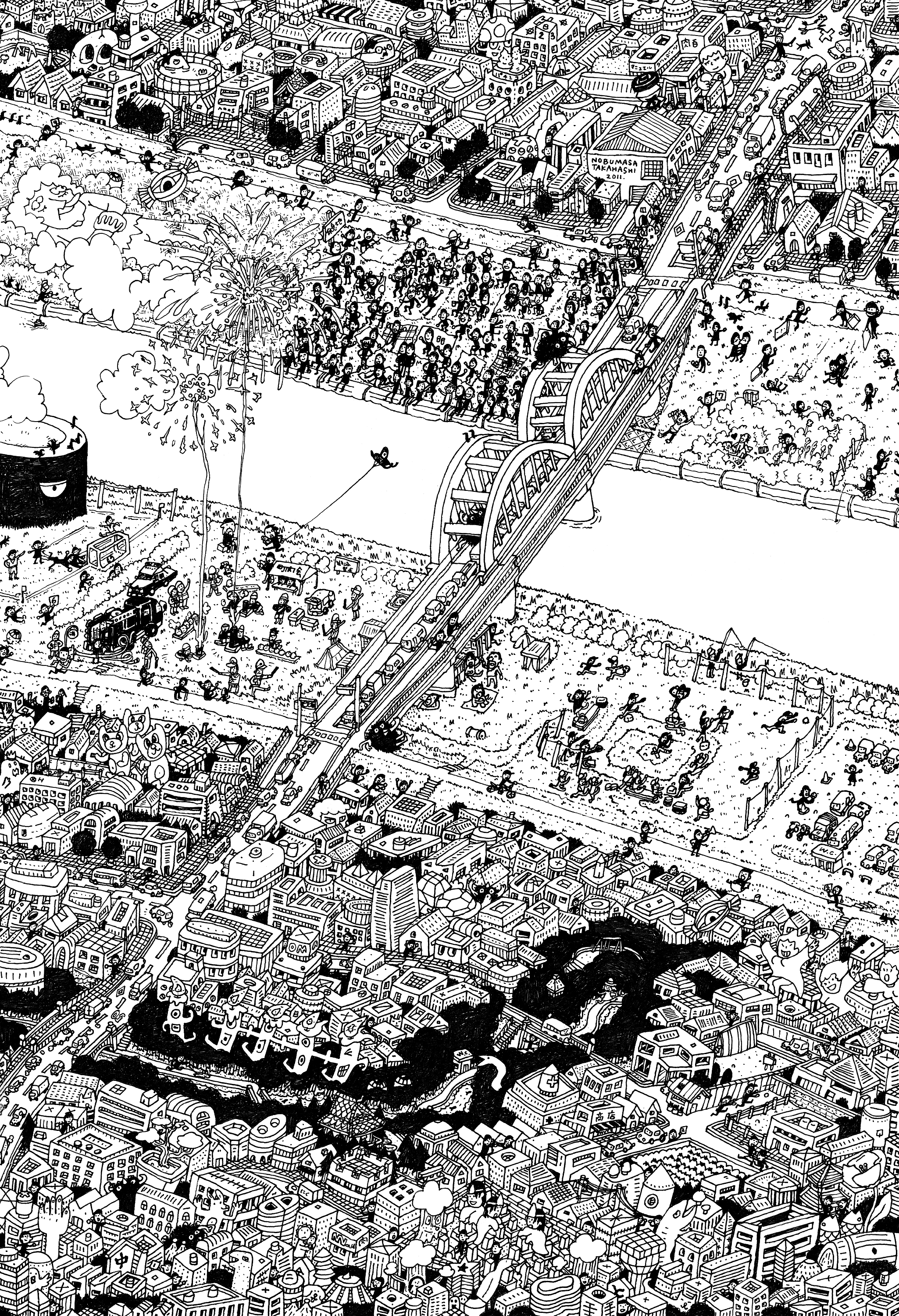 ごちゃごちゃの町並みに癒着する渓谷や、林。お墓、盆栽、寺、空き地、畑、異世界の住民達の居場所。海外では見られない都心一等地に突如と現れる広大な河川敷。そこでは、野球、サッカー、花火、凧揚げ、ラジコン、つり、ホームレス、休息地、セックス、初キッス、昼寝、ダンボールそり遊び、烏、お弁当食べる、等、様々なことが日々行われている。脈絡のない町並みには、東京特有の色々な動物達や、商店街、銭湯、キャラ等も混ぜ込んだ。