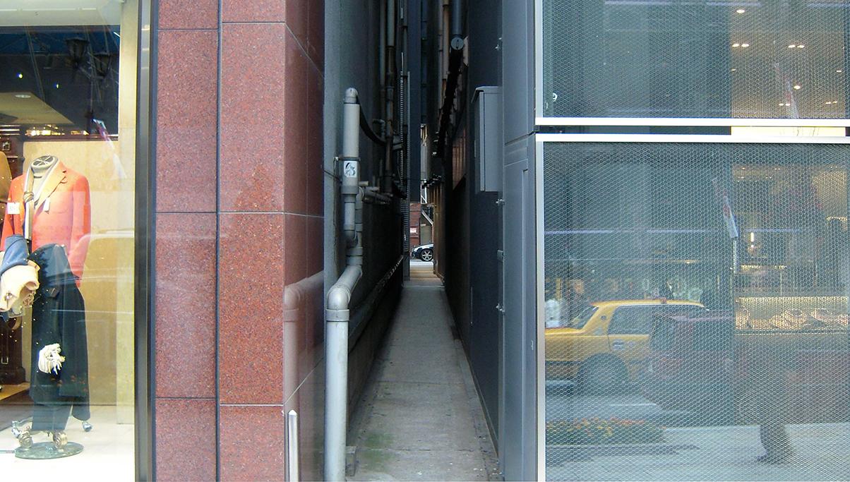 建物にはあんまり意味がなく、看板が主張している*1ハリボテ建築。ハリボテ建築の前を何も疑わずに、日本特有の通勤風景、黒スーツサラリーマンの行列が流れていく。