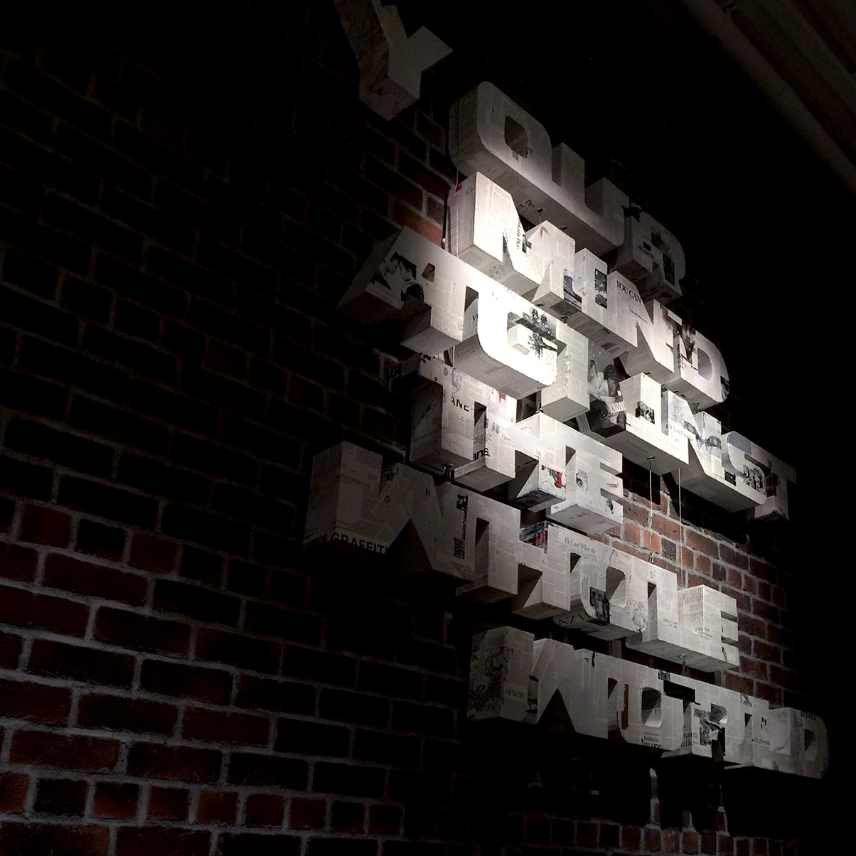 作品の「YOUR」は「Y」が離れて「君(YOUR)」から「我々(OUR)」と変わります。代々引き継がれてきた「TY」から先代の「Y」が離れ「SONS」息子達が継ぐことになった2015年の社名変更と掛けた作品です。「Y(先代)へ、我たち(息子達)は世界に通用するぜ!」と皮肉を込めて。