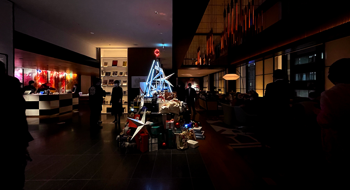 2020年「ハイアット セントリック 銀座 東京」は政府による緊急事態宣言を受けて4月18日から9月末まで休業。10月1日に再開した後のクリスマスをどのように行うのかを相談されました。一方高橋は「ハイアット セントリック 銀座 東京」からの紹介で参加した「銀座もの繋ぎプロジェクト」が大きく展開している最中、銀座の方々と一緒に行うツリーはどうかという提案をおこないました。2020年12月1~25日の間、プロジェクト参加企業に送って頂いたクリスマス仕様のギフトボックスを積み上げてクリスマスツリーを制作しました。70社以上に参加して頂きました。宿泊客の方から「朝起きてこんなに沢山のプレゼントが届いていたら一日中楽しいだろうね」と声をかけて頂きました。
