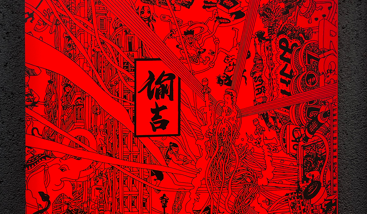2024年現在事業展開する八つの国(日本/台湾/タイ/インドネシア/フィリピン/ベトナム/カンボジア/ミャンマー)の「龍」と「成長する街」「民族画」を描きました。CG制作会社が展開する麺屋ということで電脳と現実が混在した世界観の中、エネルギー体である龍がバラけて麺(コード/cord⇄code)になりアジア中へ広がりエネルギーを届けるというストーリーです。画面を縦に三つに分けて、右面には菩提樹と遺跡など過去を、左面にはマンションや道路など現在、中央面には雑踏から飛び出すエンターテイメントと超高層ビルなどの未来を描きました。アジアが一つになりエネルギッシュに成長してもらいたいという願いを込めました。