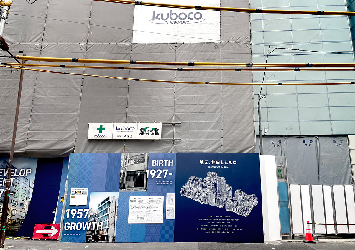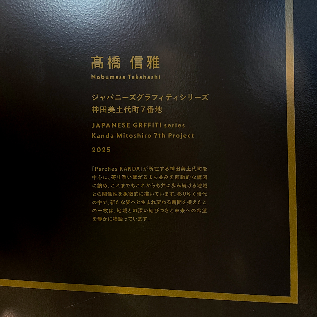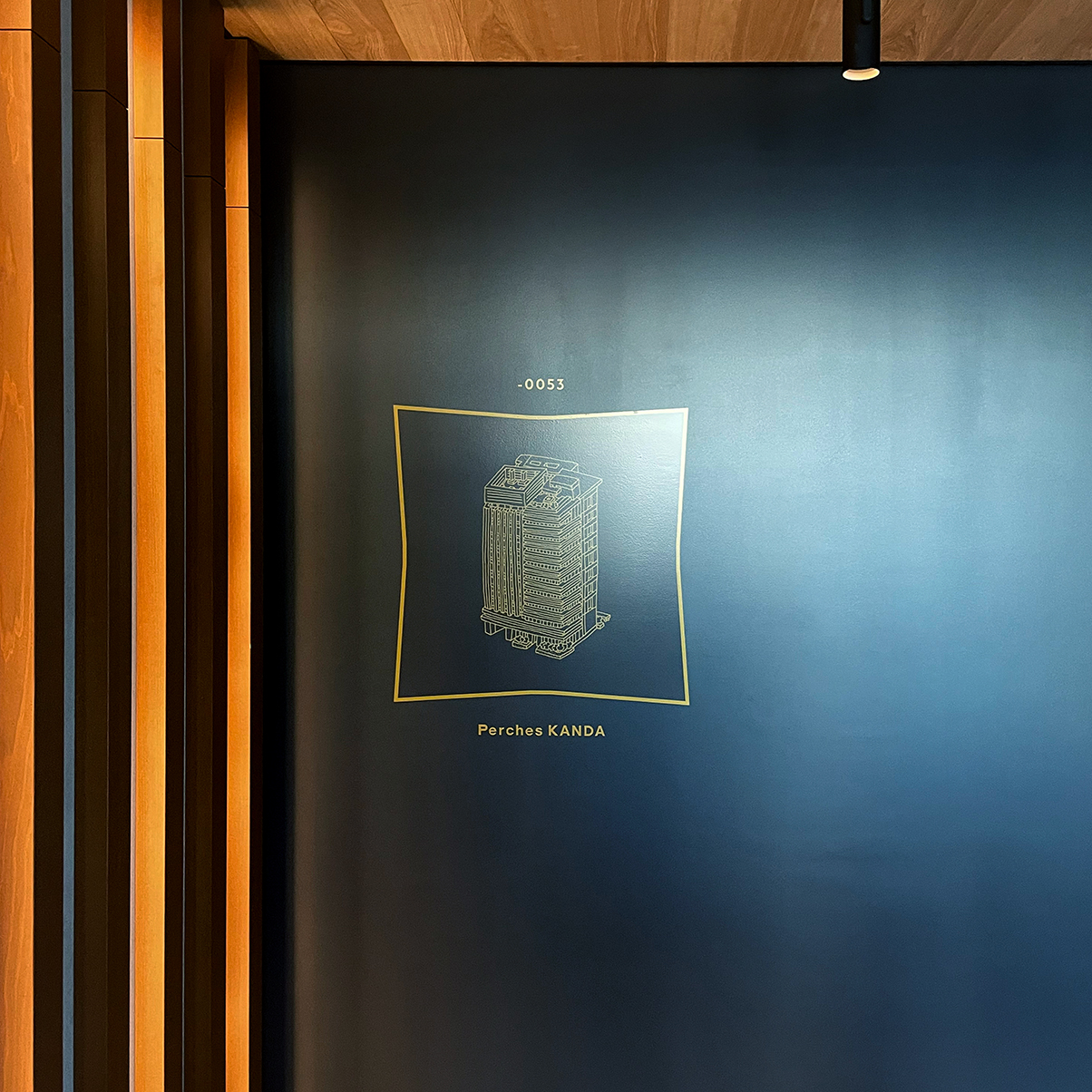 In December 2025, the new headquarters, Perches KANDA, was completed.The artwork originally created for the temporary fencing, titled “Kanda Mitoshirocho 7th Project,” has now been permanently installed on the stairway wall inside the building.