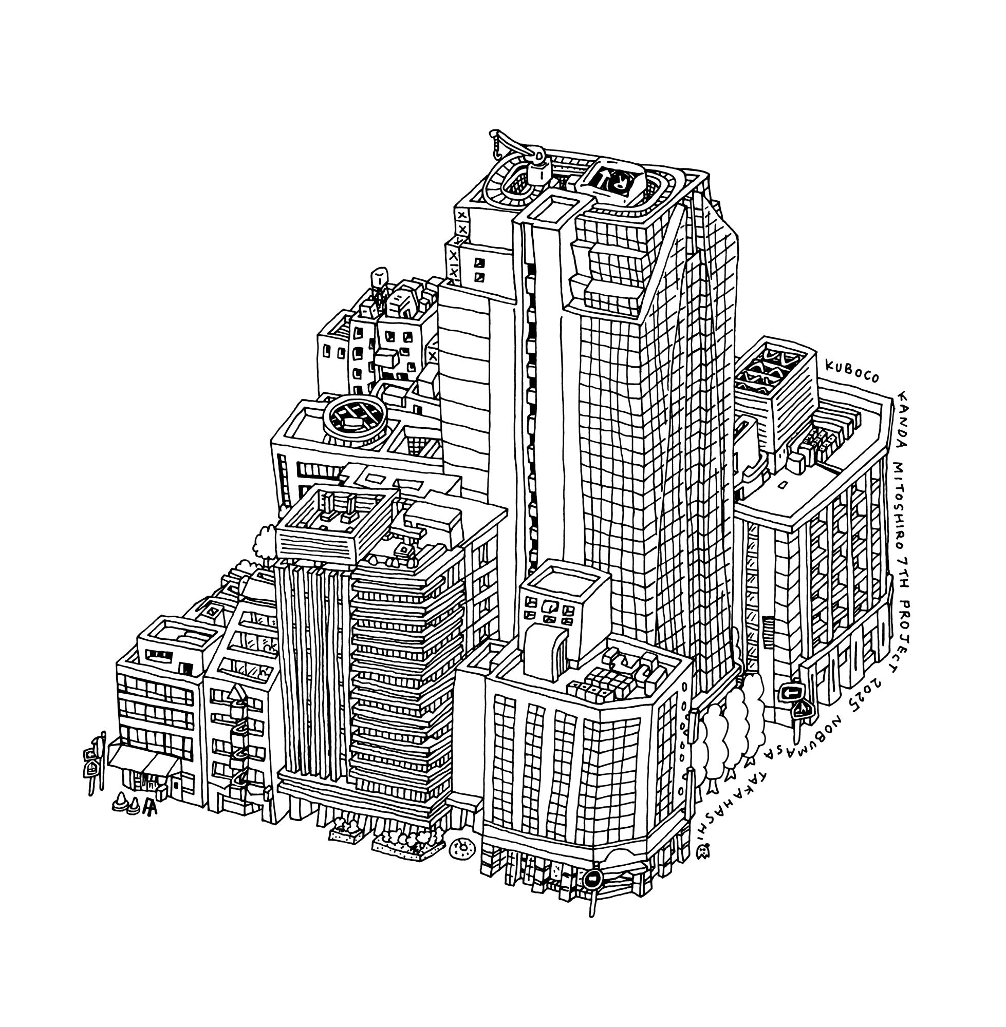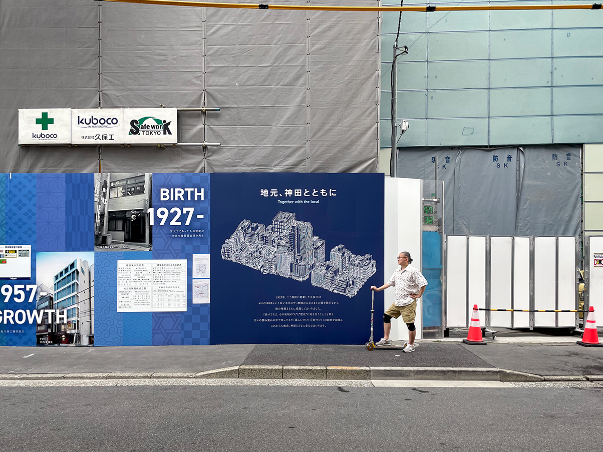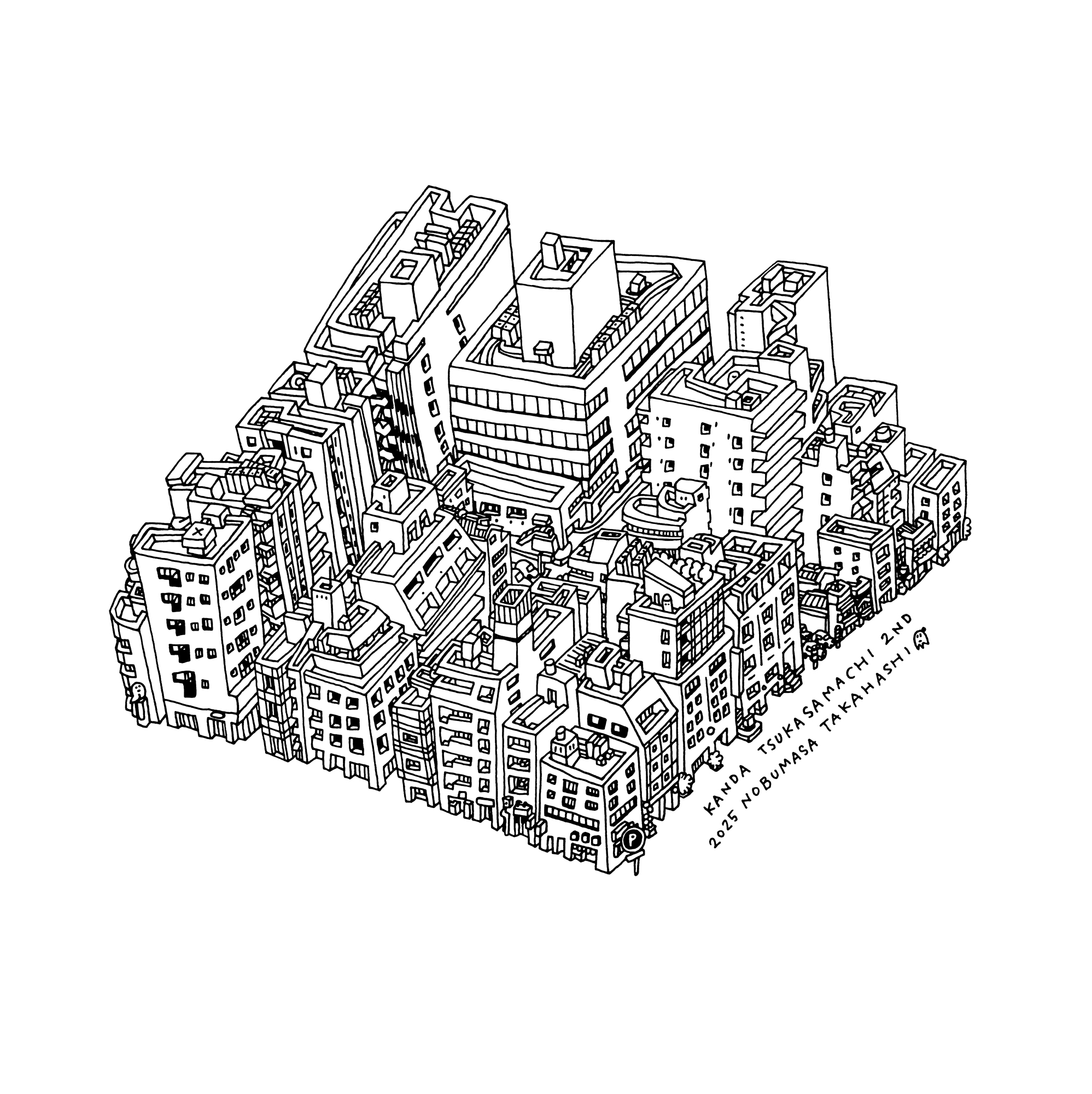 In June 2025, I created an illustration of the Mitoshirocho 7-chome area in Kanda for the temporary construction fencing of the new headquarters of Kuboco, a general construction company based in Kanda, Tokyo.