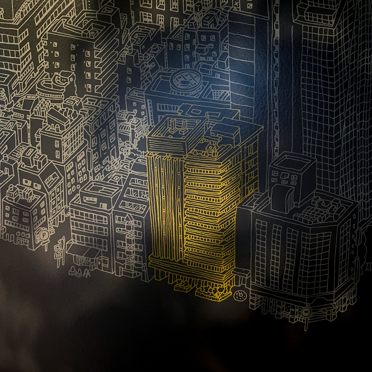 2025年12月17日、新社屋「Perches KANDA(パーチスカンダ)」が竣工したので見学に行ってきました。仮囲い用に描いた作品「神田美土代町七番地」を、階段の壁面に常設していただいています。