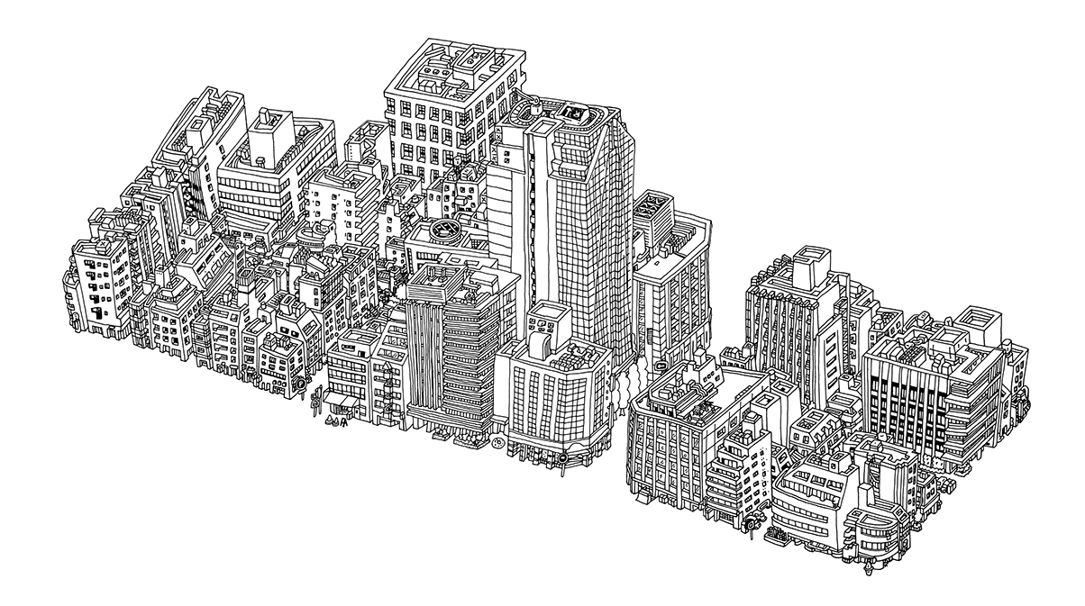 「神田美土代町7丁目」にそびえ立つ新社屋を「北北東」から「南南西」に向かっての視点で描きました。旧社屋のある1丁目と3丁目も構図に組み込み、移りゆく時間の中で生まれ変わるこの瞬間をとらえました。